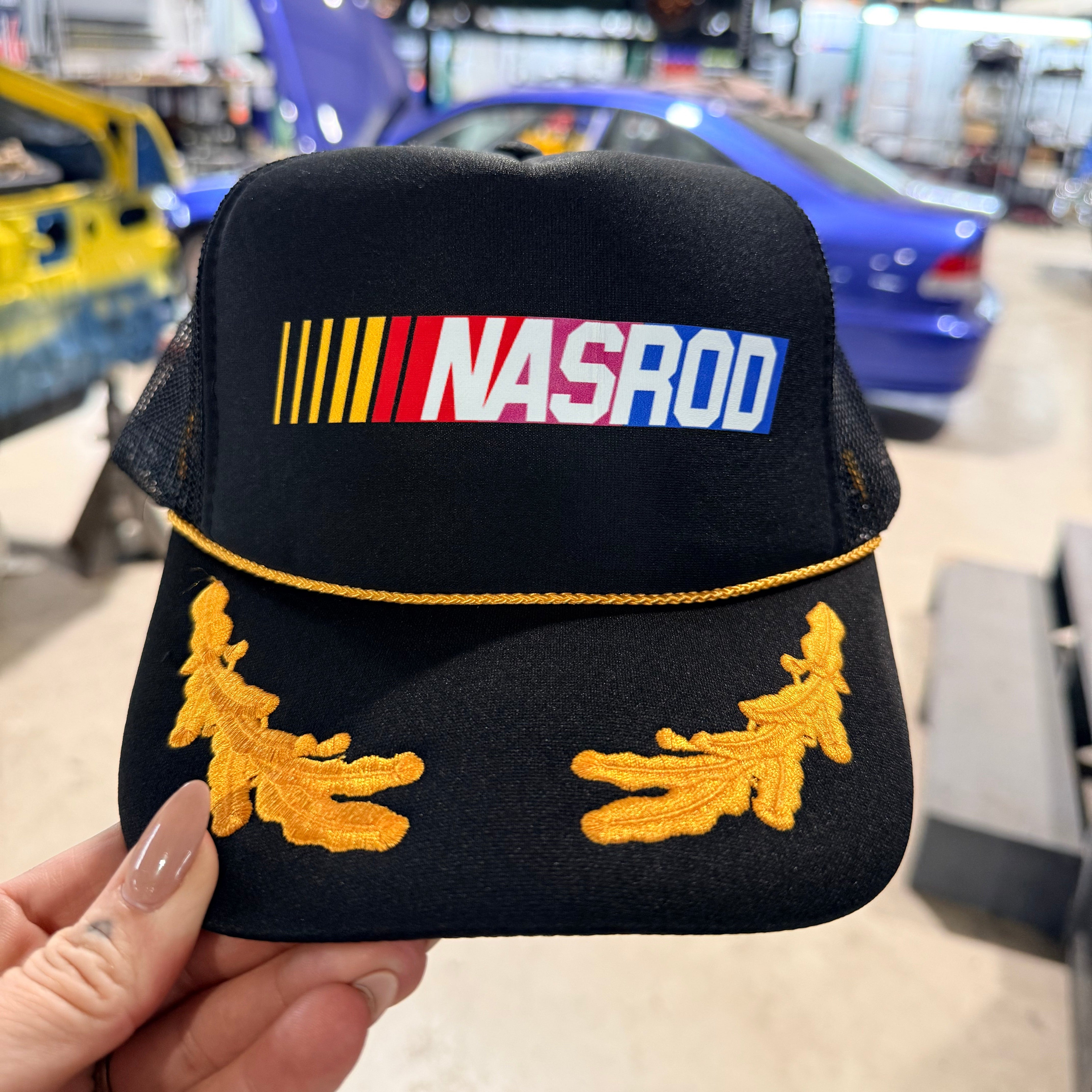 Black OTTO Trucker hat featuring the NASROD logo. Hat is foam front, mesh back, snap back.